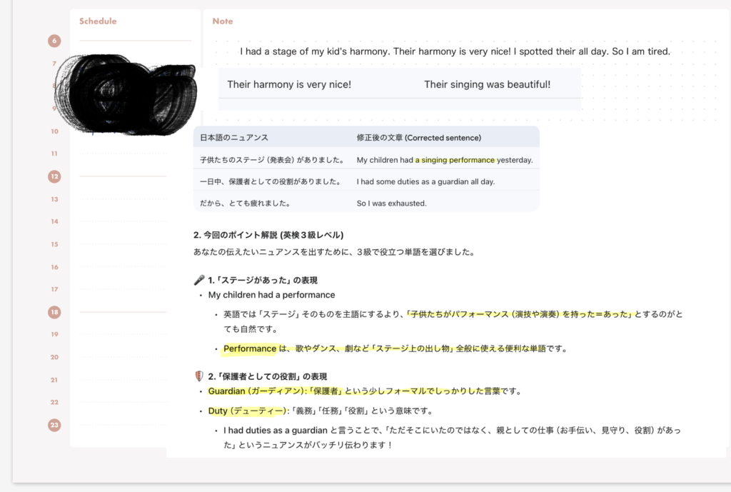 分からない箇所は日本語で書いたり、本当はこう書きたかったと伝えると、とても優しく教えてくれます。